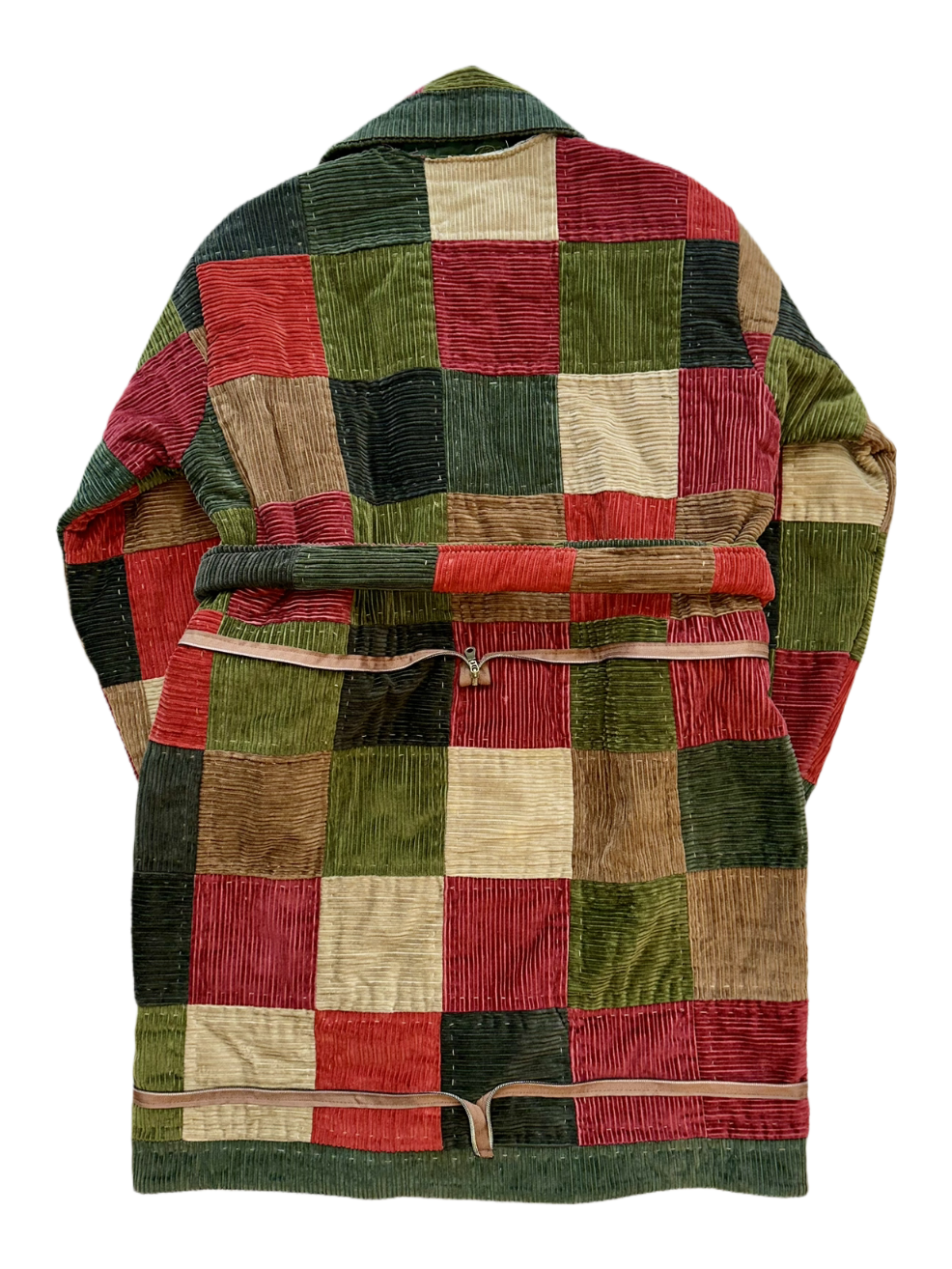 Fitilli kadife paneller ışığı yakalayarak derinlik ve dokusal zenginlik katar; her panel farklı bir geçmiş ve doku sunar. Kahverengi fermuar detaylarıyla tamamlanan tasarım, rustik ve miras estetiğine atıf yapan bir denge kurar.