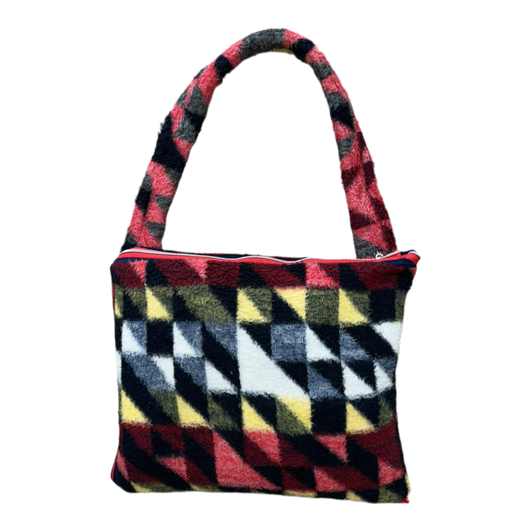 Kırmızı fermuar detaylı cesur geometrik palet, retro ve fütüristik bir denge kurarak her açıdan bakışları toplar. Üretimde kullanılan vintage kumaşlar titizlikle seçilir; her parça kendi geçmişini ve benzersiz dokusunu taşır. Kumaşlardaki ince farklılıklar ürünün karakterinin bir parçası olarak korunur.