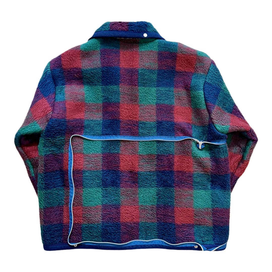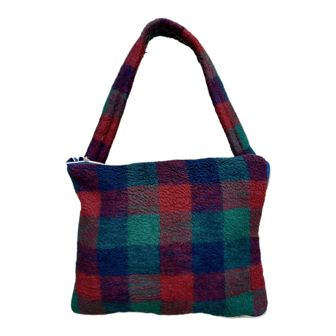 Soğuk ve sıcak tonların kontrastı; lacivert, orman yeşili ve koyu kırmızı karelerin dengeli birleşimiyle estetik bir görünüm oluşturur. Şardonlu doku hem dokunsal yumuşaklık hem de belirgin bir yapı sağlar; işçilik her parçanın vintage karakterini koruyacak şekilde özenle yapılmıştır. Lacivert fermuar detayları tasarıma uyumlu ve sade bir bitiriş sunar.