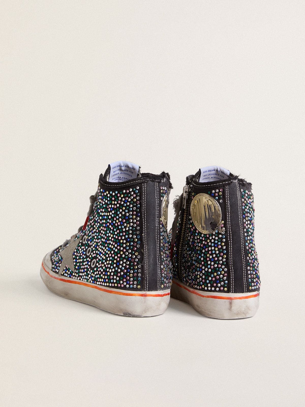 Siyah kanvas topuk bandı, gri süet yıldız ve çok renkli rhinestone süslemeleri estetik bir denge oluşturur. Üst yüzeyde pamuk ve inek derisi kombinasyonu, iç astarda deri katkısı ve dayanıklı kauçuk taban el işçiliğini ve malzeme seçimini ön plana çıkarır. Distressed görünüm ve foxing üzerindeki turuncu şerit gibi küçük detaylar modele karakter katar.
