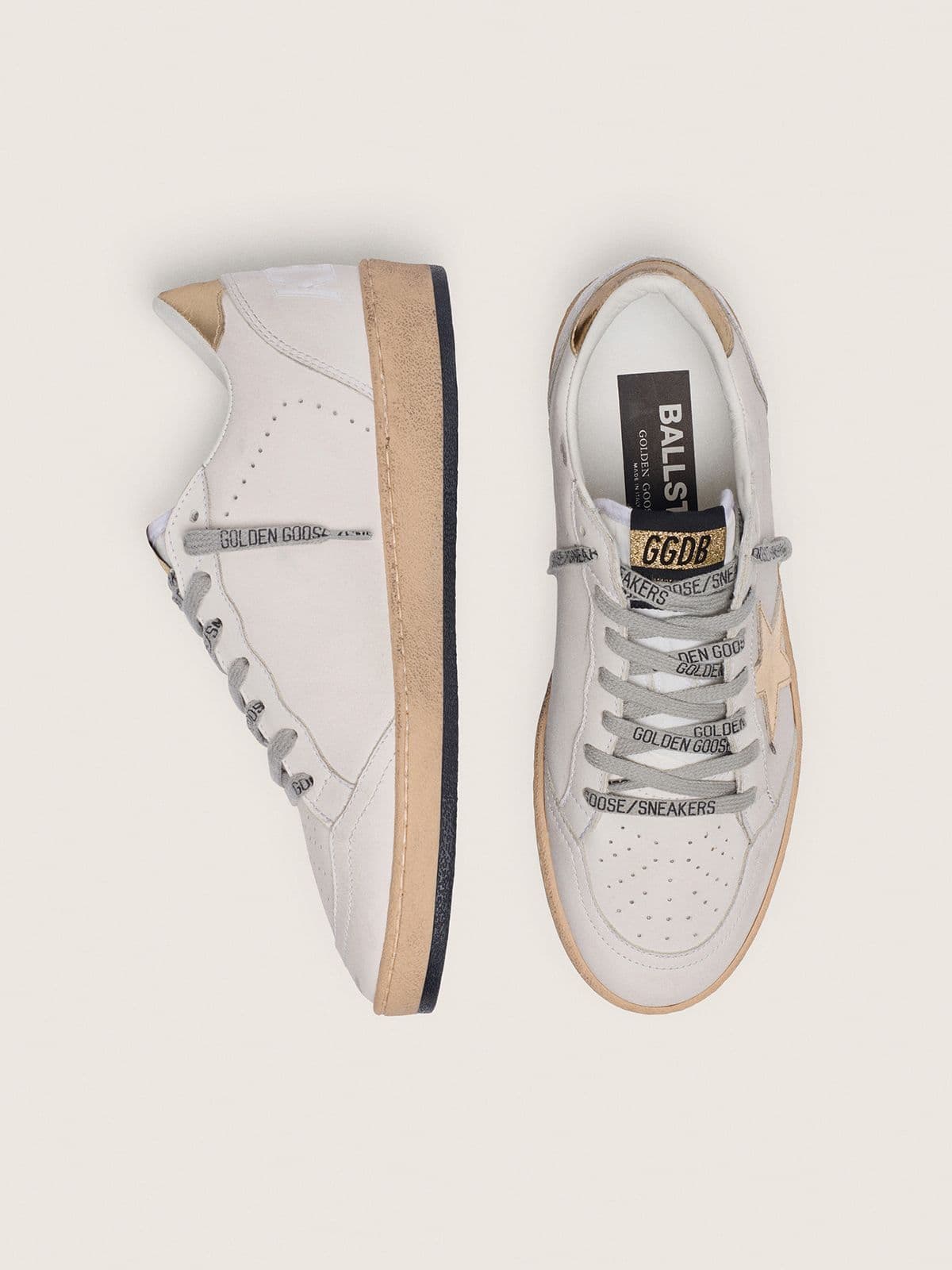 - Renk/Detaylar: Beyaz deri üst, altın lamineli yıldız ve topuk bandı, gri bağcıklar (logo detaylı)