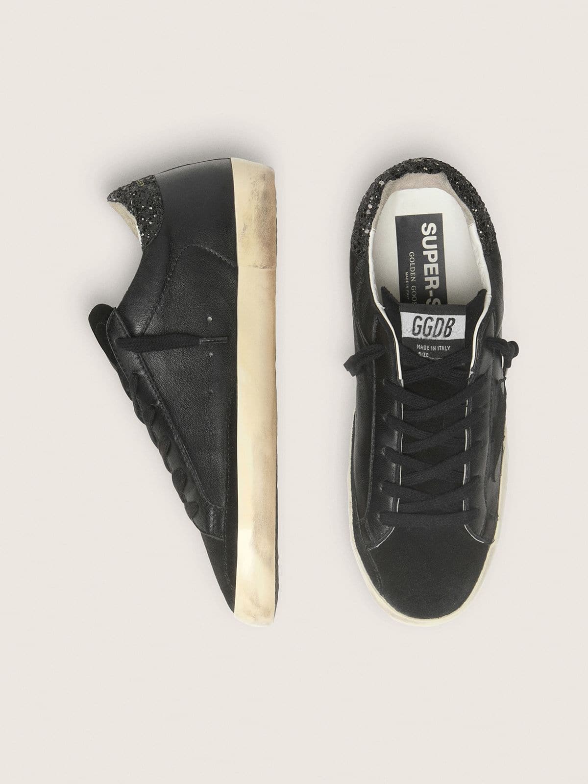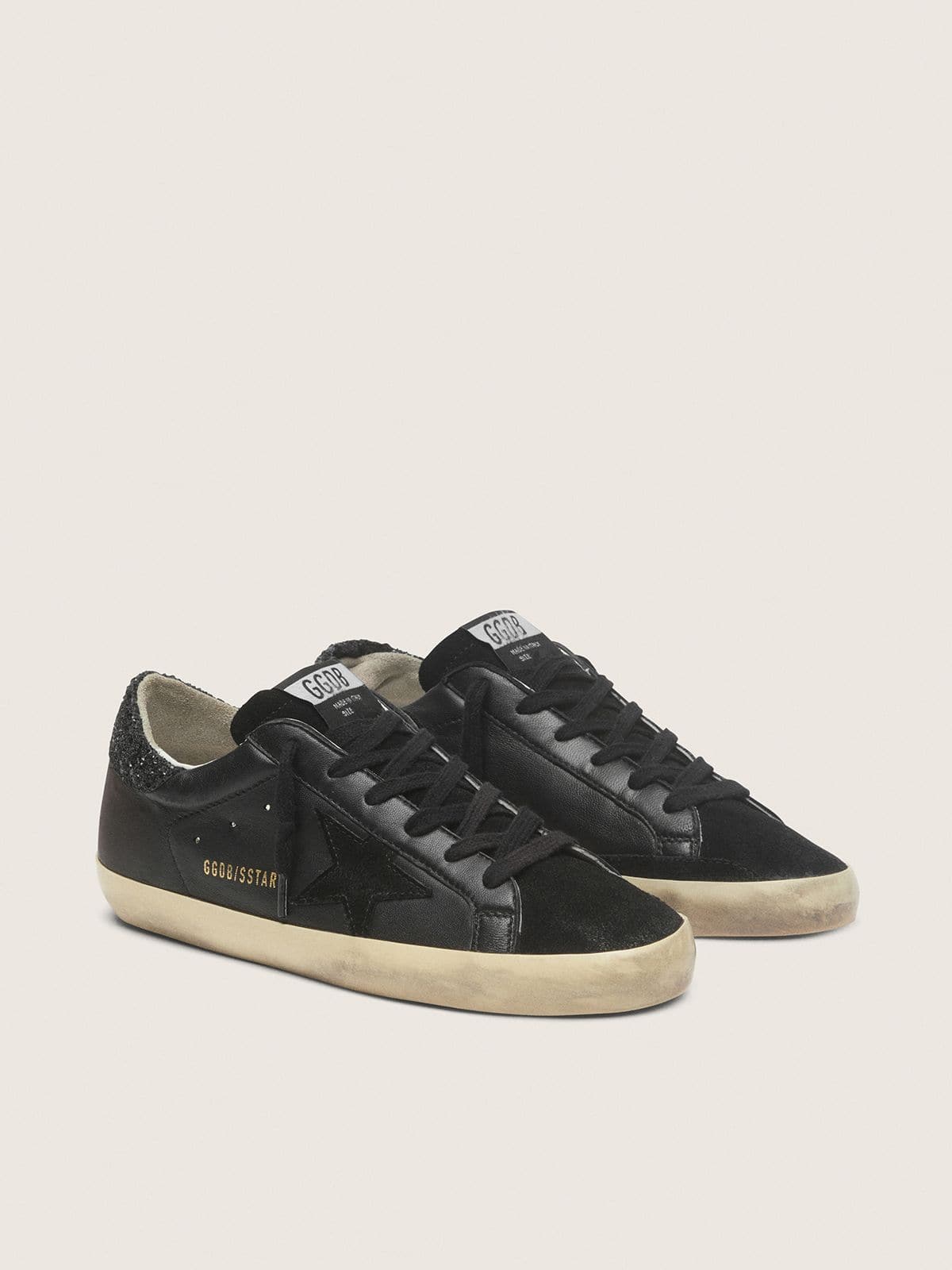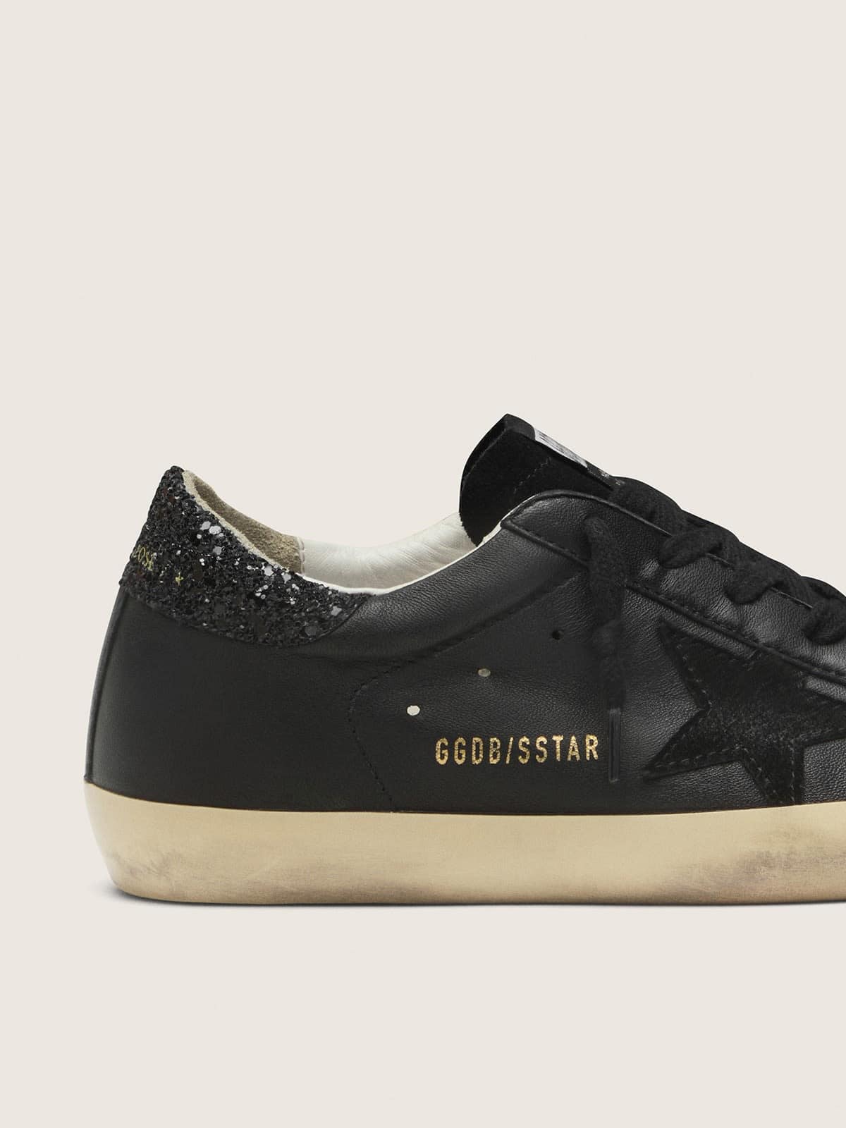 Golden Goose Women’s Super-Star In Black Nappa With Black Star And Glitter Heel Tab