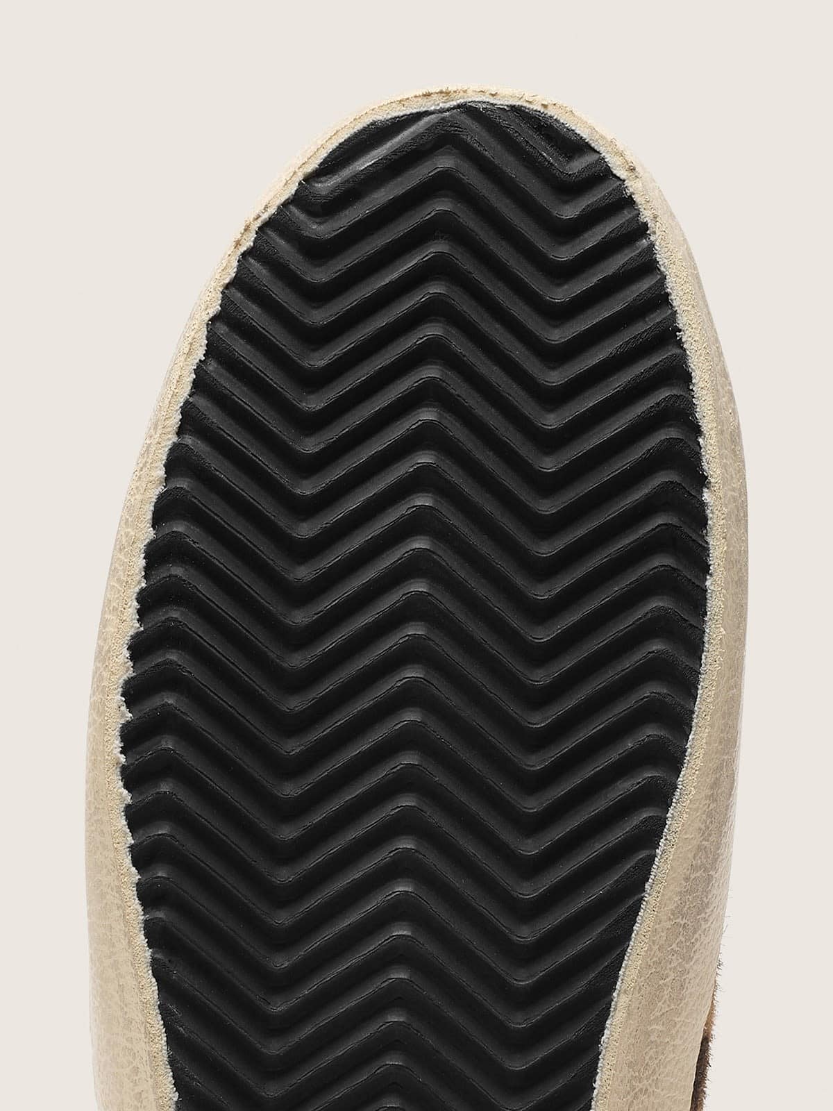 Üst kısım leopar desenli flocked deri ile tamamlanmış; süet GGDB yıldızı ve siyah deri topuk detayları tasarıma karakter katar. Astar %60 dana derisi ve %40 pamuk karışımından, taban ise %100 kauçuktan üretilmiştir; vintage finisaj ve el işçiliği üretime zarif bir dokunuş ekler.