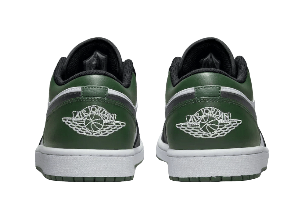 Jordan 1 Low Green Toe, siyah Swoosh'lar ve dillerle birlikte beyaz, siyah ve Noble Green deri üst yüzeyine sahiptir. Yeşil delikli parmak kutusu, siyah deri burun sargısı ile birleştirilerek estetik bir denge oluşturur. Beyaz ve yeşil Air taban tasarımı, genel görünümü tamamlayarak şıklığı artırır.