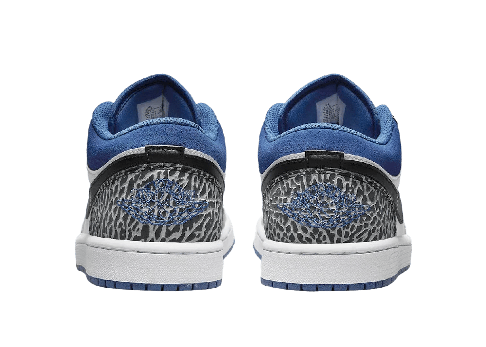 Air Jordan 1 Low SE True Blue, üst kısmında burun çevresini saran gri dokulu deri ve beyaz deri taban ile zarif bir denge sunmaktadır. Ayakkabının topuk ve göz kısımlarında yer alan fil baskısı, tasarıma özgün bir karakter katarken, mavi süet detaylar da estetik bir bütünlük oluşturur.