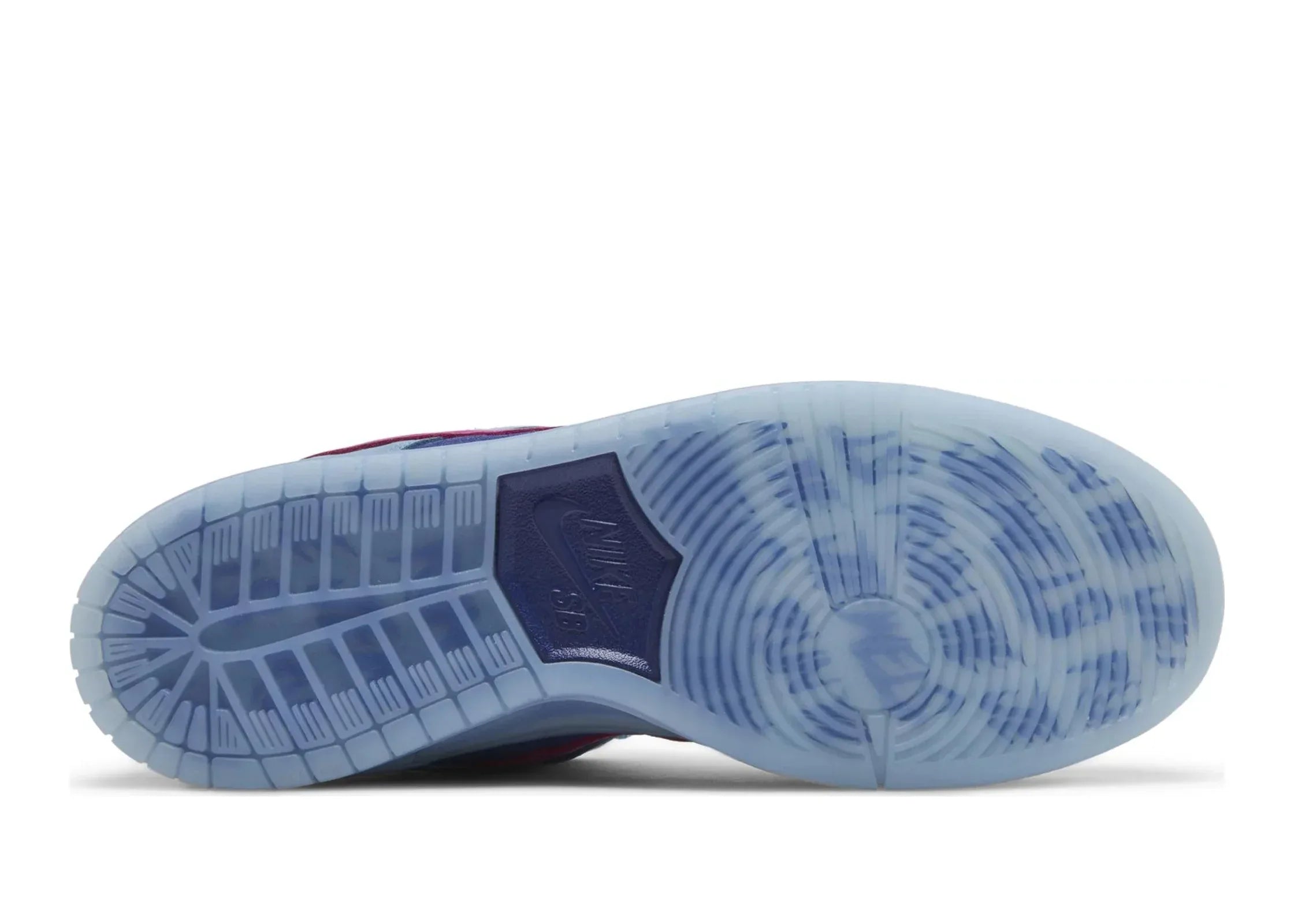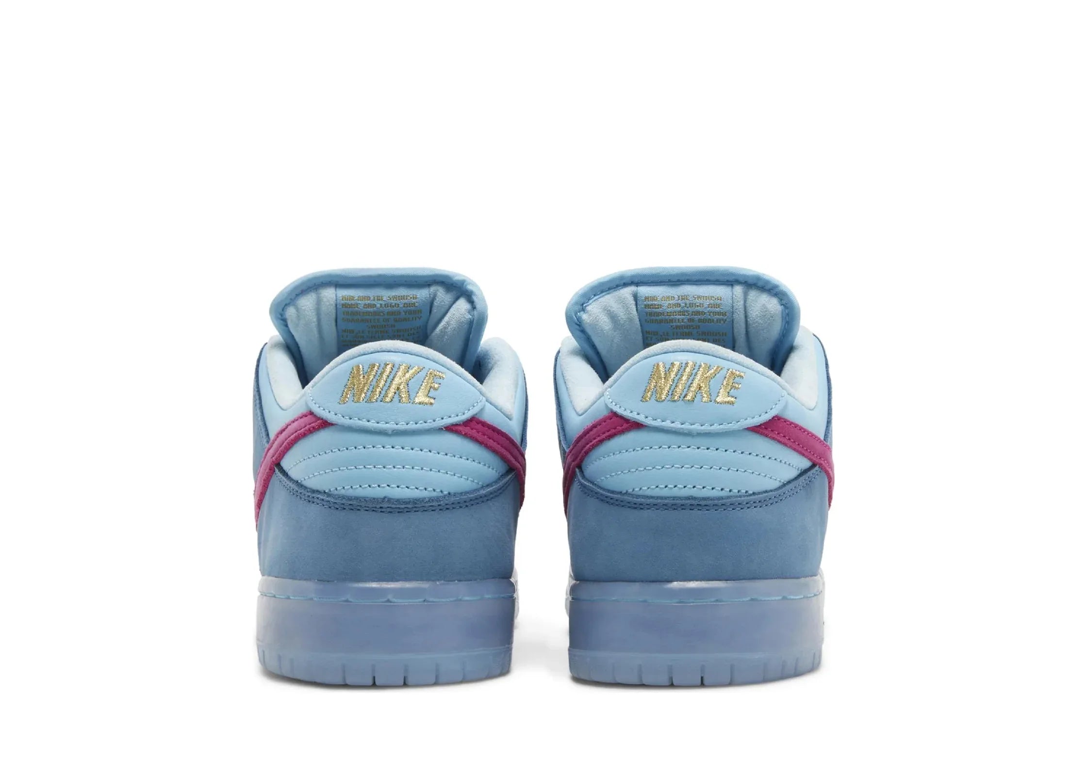 Nike SB Dunk Low Run The Jewels, yarı saydam mavi dış tabanın üzerine oturan mavi süet üst kısımlarla üretilmiştir. Nike, Swoosh'ta pembe süet kullanarak tasarıma farklı bir dokunuş katmıştır. Altın markalı vurgular, ayakkabının estetik dengesini tamamlar.