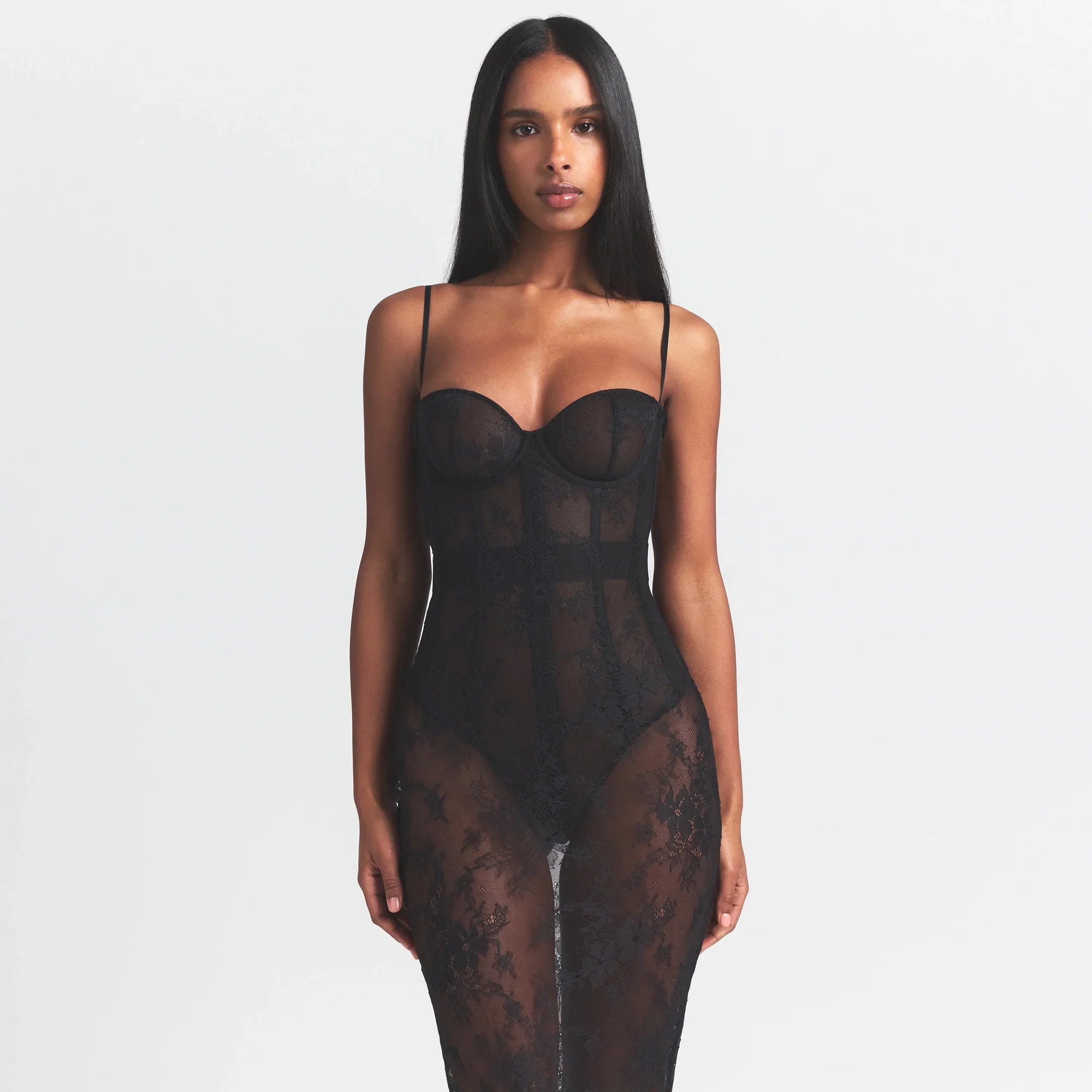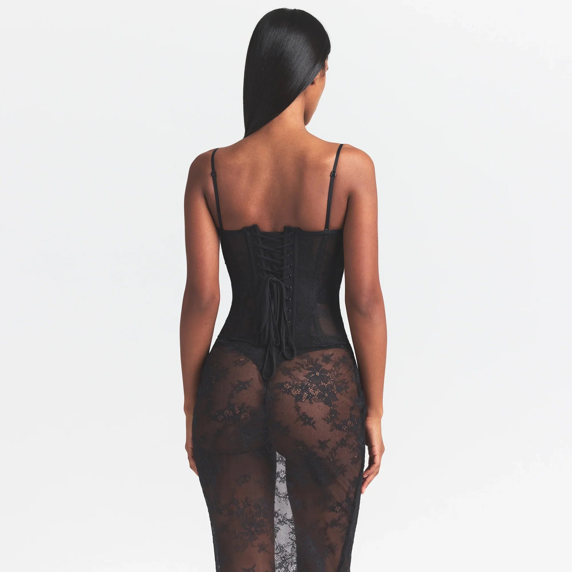 SKIMS ULTRA FINE LACE STRAPLESS CORSET LONG DRESS | ONYX