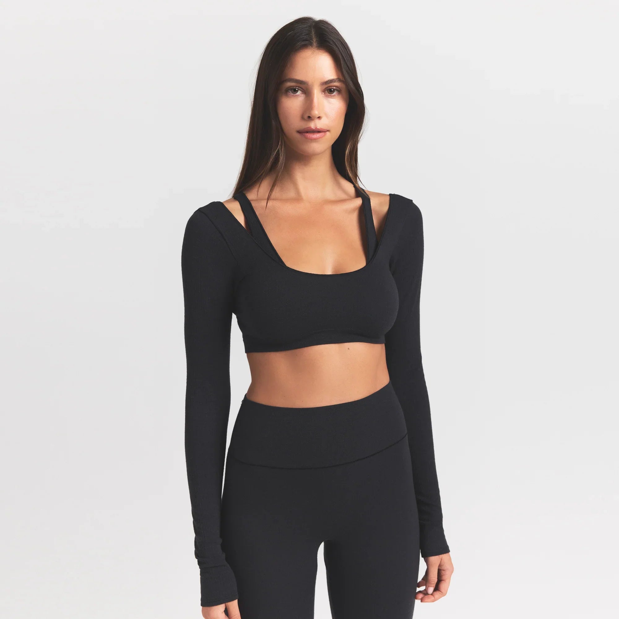 SKIMS WOOL RIB LONG SLEEVE SUPER CROPPED TOP | OBSIDIAN